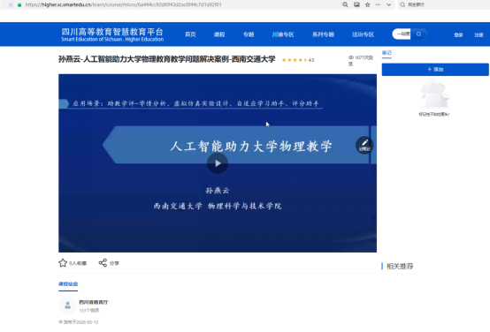 物理科学与技术学院孙燕云老师开发的“人工智能助力大学物理教育教学问题解决案例” 继入选教育部教育技术与资源发展中心组织的教师人工智能应用案例的培育案例之后,近日正式在四川高等教育智慧教育平台上线。